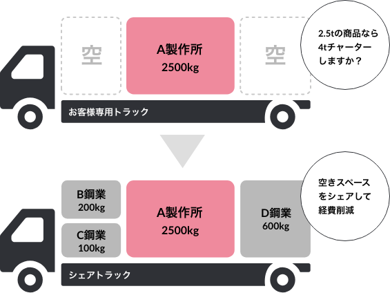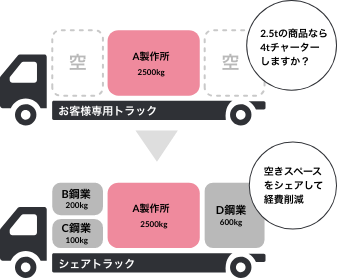 6mまでの商品で他社に断られてトラック一台をチャーターしていたお客さまは、混載することで数十%のコスト削減が見込めます。